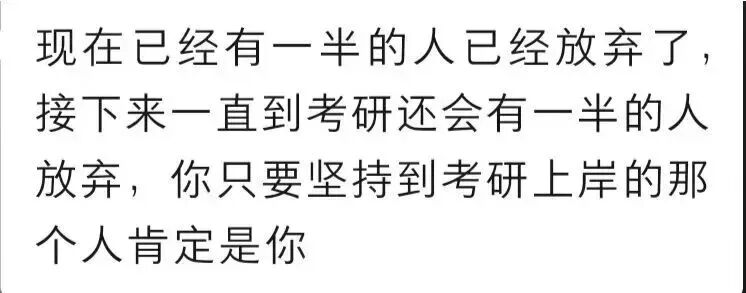 每年我们都会说:现在已经有一半的人已经放弃了,接下来一直到考研还会有一半的人放弃,你只要坚持到考研上岸的那个人肯定是你。