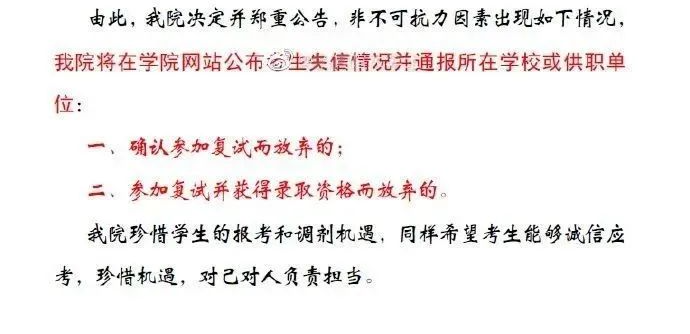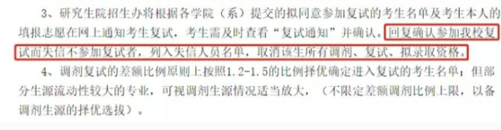 某校“2022年硕士研究生复试录取工作方案”明确规定:“研究生院招生办将根据各学院提交的拟同意参加复试的考生名单在网上通知考生复试,考生需及时查看“复试通知”并确认。回复确认参加我校复试而失信不参加复试者,列入失信人员名单,取消该生所有调剂、复试、拟录取资格。”学校能够郑重其事地形成如此制度,表明每年都遇到一些考生放弃复试机会,因此不得不思考从制度上解决问题,于是建立了此项制度。某院校在复试录取工作方案中也提到:“回复确认参加我校复试而失信不参加复试者,列入失信人员名单,取消该生所有调剂、复试、拟录取资格。”